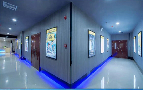 湖南郴州湘華電影城共采用三種吸音材料:環保槽木吸音板、生態木穿孔吸聲板、防火聚酯纖維吸音板。電影院收銀臺墻面與吊頂位置采用生態木穿孔吸音板、影城走廊兩側采用環保13/3槽孔吸音板。影視廳內墻面采用聚酯纖維吸音板。聚酯纖維吸音板共用800┫,環保槽孔吸音板210平方米,生態木穿孔吸聲板185平方米。
