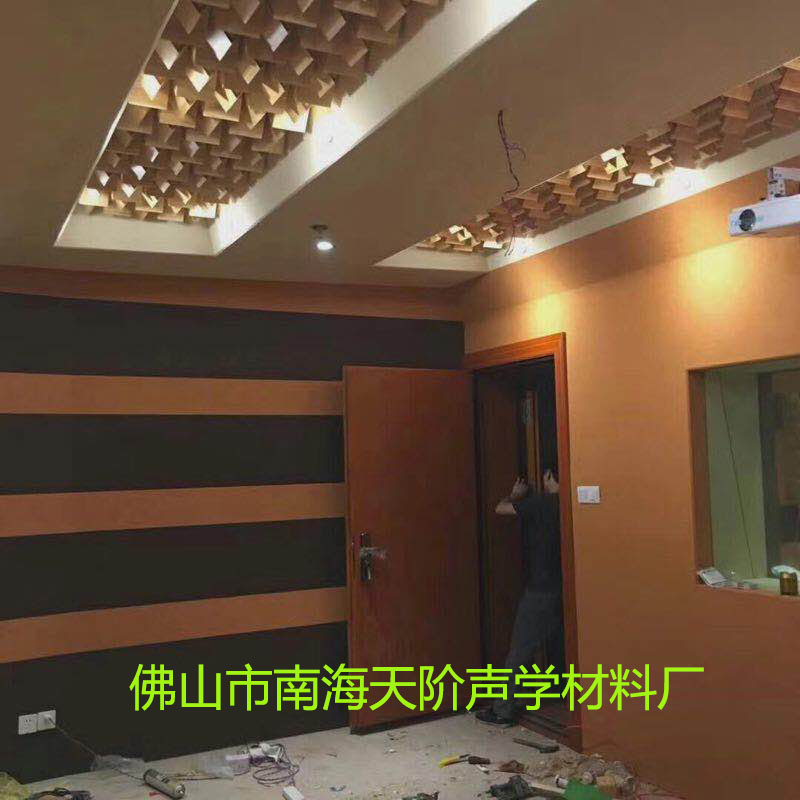 第一層整體木龍骨架主要起支撐與固定的作用,要采用較粗的木龍骨材料,縱橫木龍骨的個數可相對較少。第二層木龍骨架材料較纖細,主要起固定玻璃棉的作用。雙層玻璃棉主要是與100mm空氣間隙共同起到隔音的作用,同時也輔助多孔板吸音。