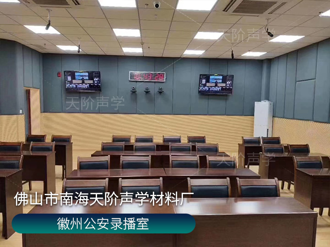 徽州公安錄播室 選用長條槽木吸音板與軟包吸音板搭配使用,吸音效果顯著。