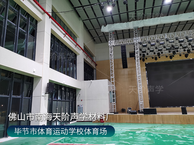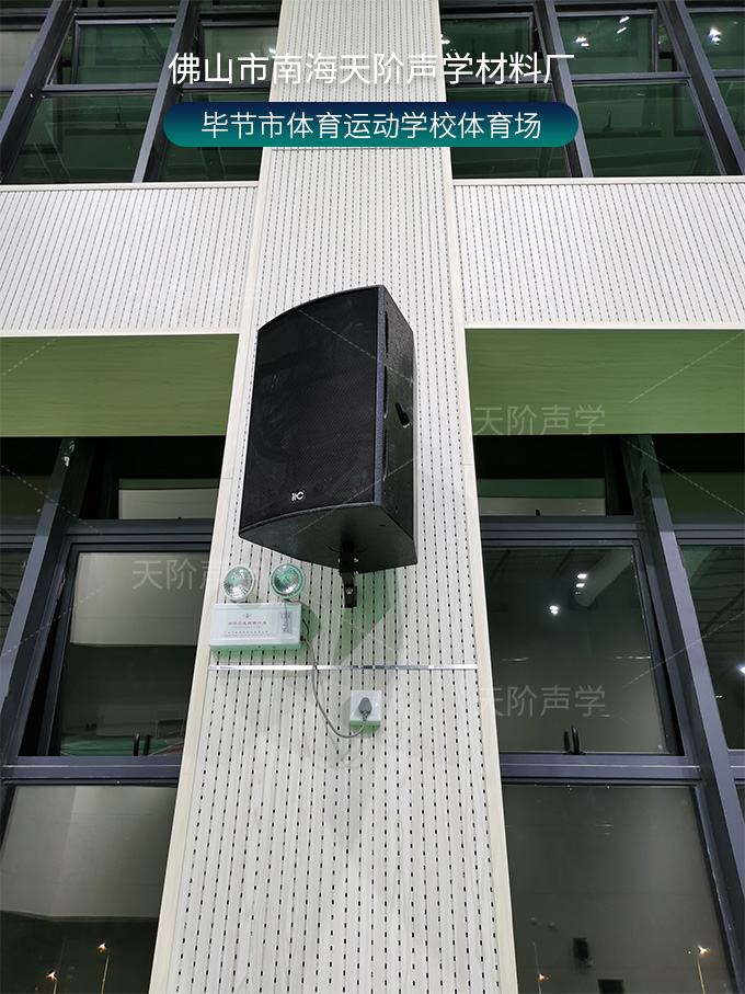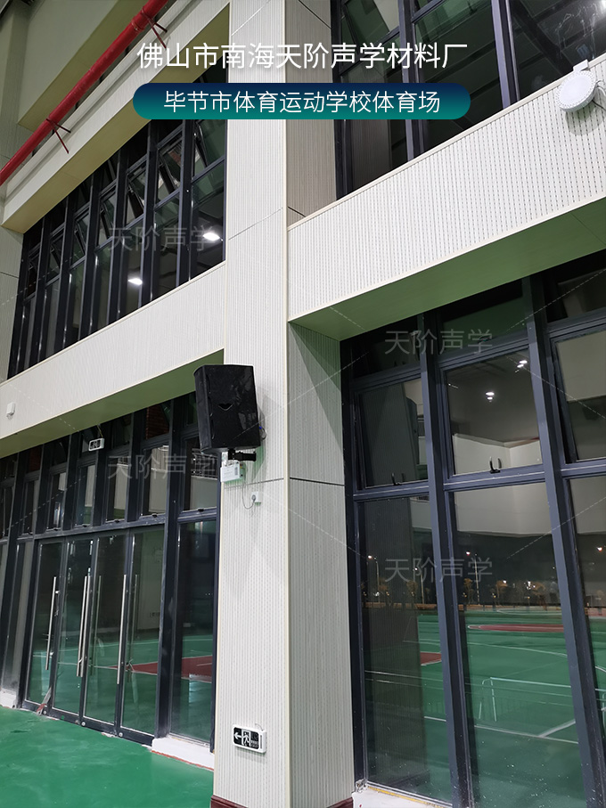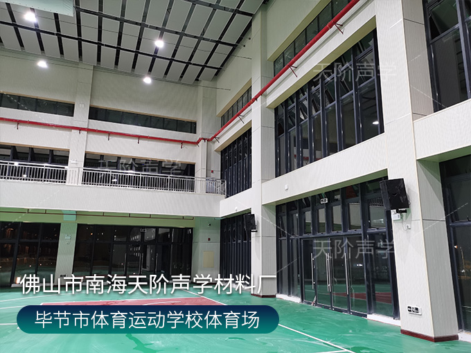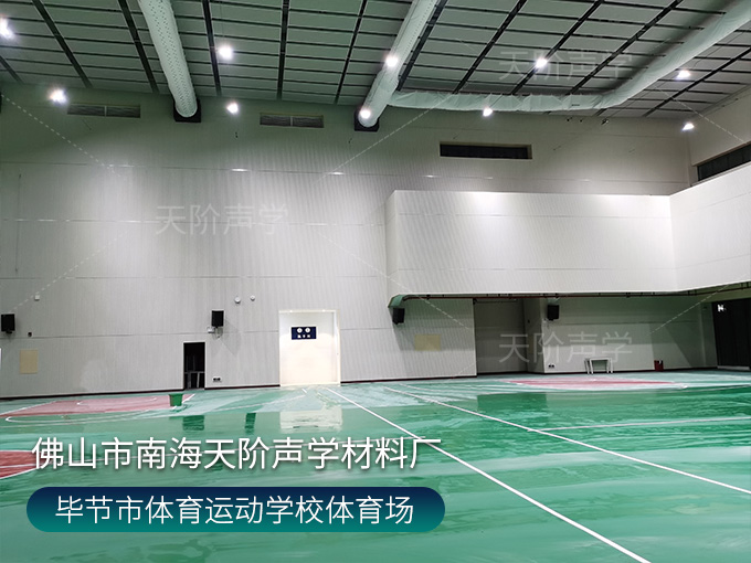畢節市體育運動學校體育場項目改造中,使用平板吊頂空間吸聲體用頂部吸音裝飾;墻面選用白色飾面的槽木吸音板,基材選用不燃的玻鎂基材,裝飾設計美觀,有出色的降噪效果。