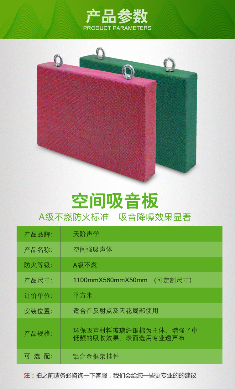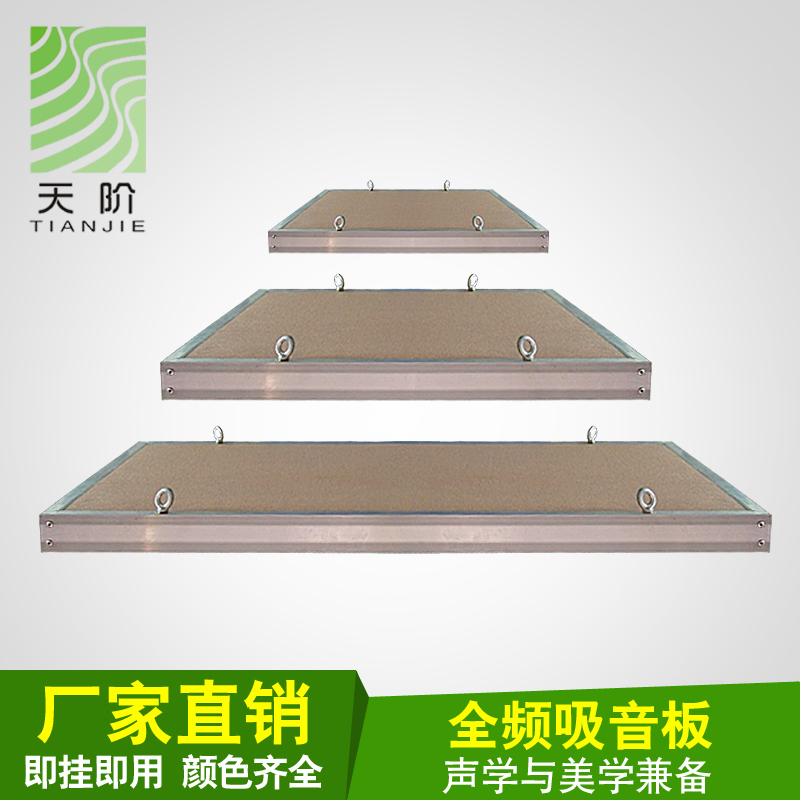 空間吸聲體的吸聲性能常用不同頻率的單個吸聲體的有效吸聲量來表示。空間吸聲體吸聲降噪(或降低混響時間)的效果主要取決于空間吸聲體的數量、懸掛間距以及材料和結構