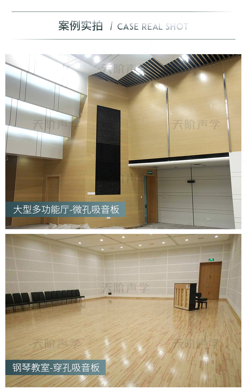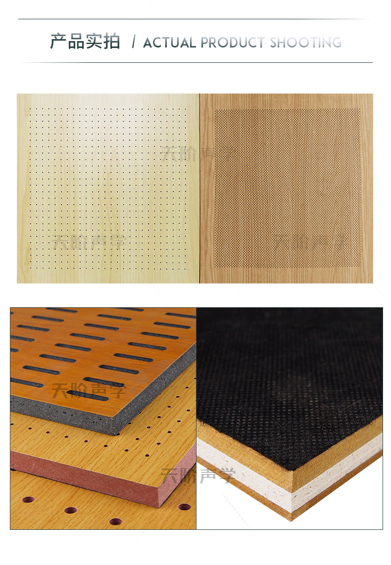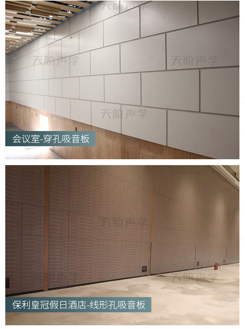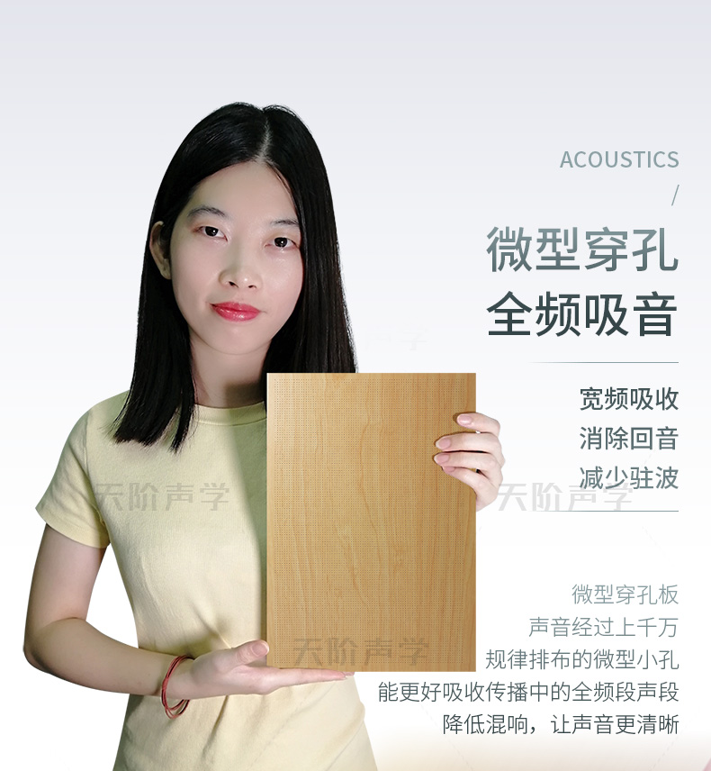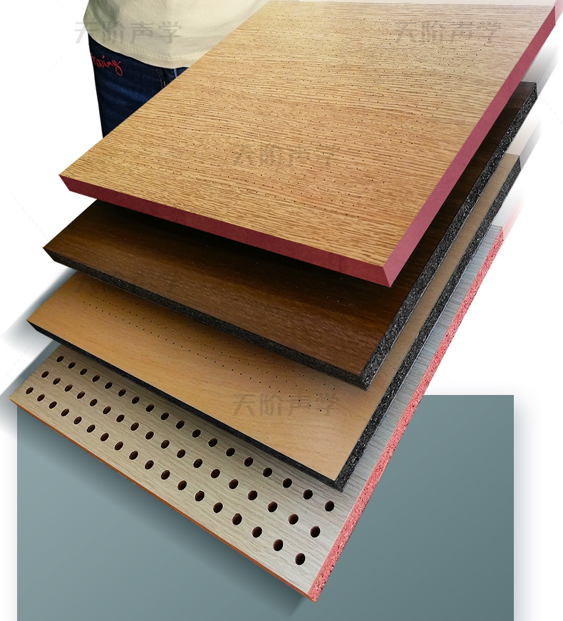 孔木吸音板是一種在密度板上直接穿孔的共振吸聲材料??啄疚舭鍖ξ曨l譜選擇性較強(qiáng),對低頻有很好的吸聲性能。如在吸聲結(jié)構(gòu)后空腔上填入適量的吸聲棉可提高中、高頻吸聲效果。 我們的孔木吸音板: 天階聲學(xué)孔木吸音板采用高質(zhì)的中纖板、具有環(huán)保、防火、防潮等性能,飾面顏色及材料選擇性廣,能很好地滿足客戶多樣化的聲學(xué)及裝飾需求。較槽木吸音板,孔木吸音板相對抗撞擊能力強(qiáng)。