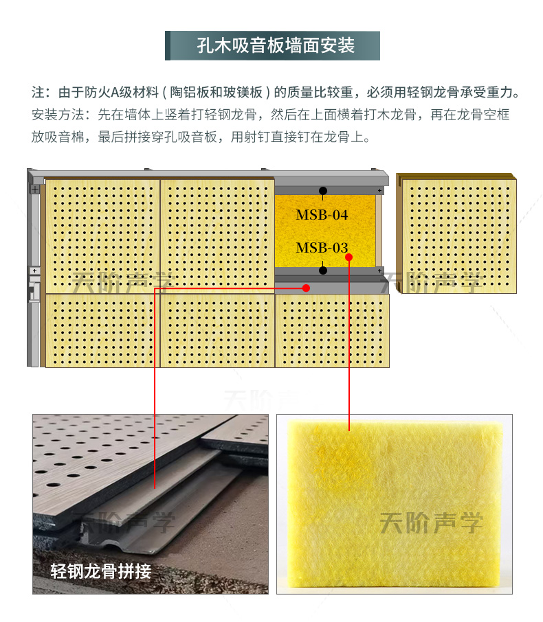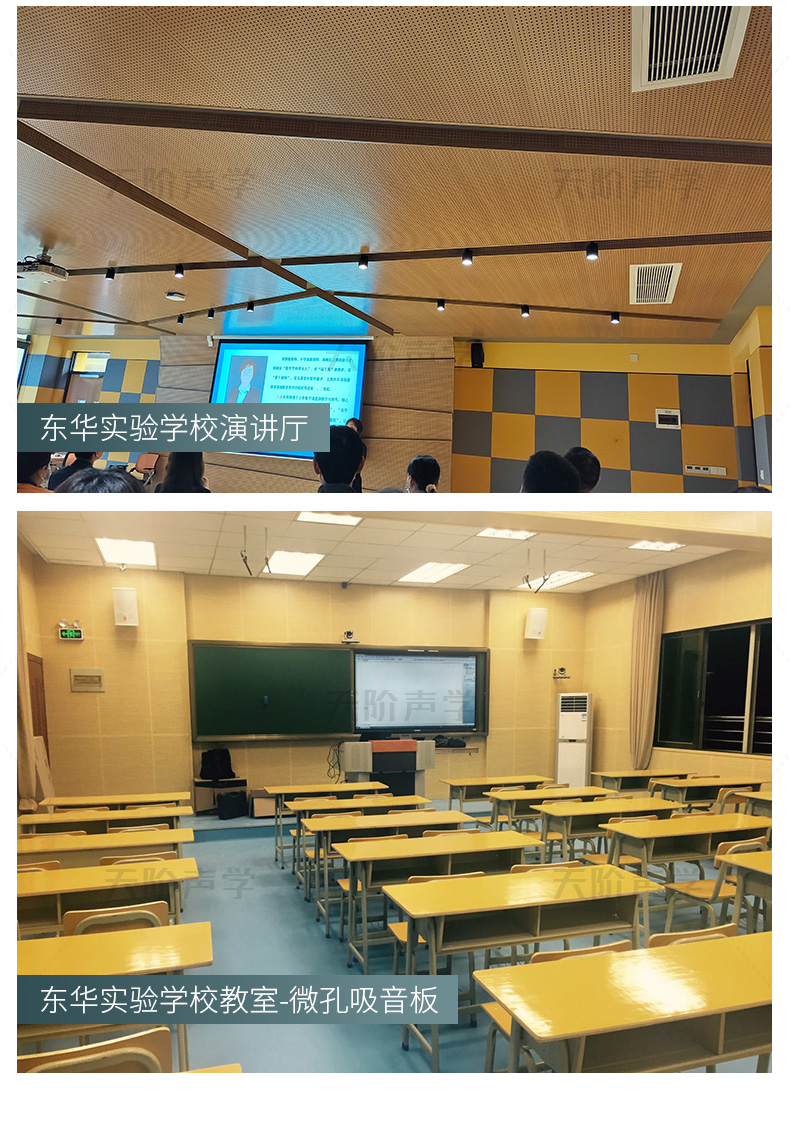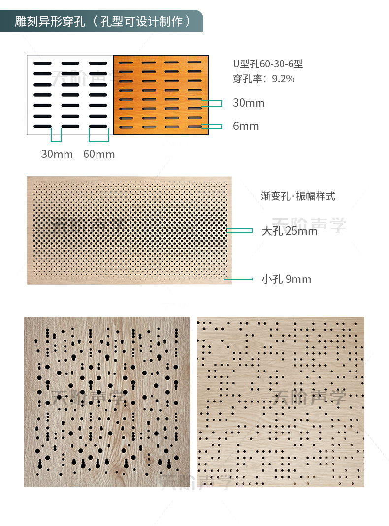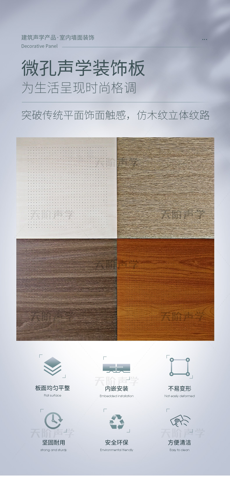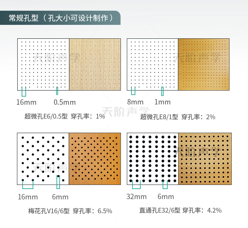孔木吸音板是一種在密度板上直接穿孔的共振吸聲材料??啄疚舭鍖ξ曨l譜選擇性較強(qiáng),對低頻有很好的吸聲性能。如在吸聲結(jié)構(gòu)后空腔上填入適量的吸聲棉可提高中、高頻吸聲效果。 我們的孔木吸音板: 天階聲學(xué)孔木吸音板采用高質(zhì)的中纖板、具有環(huán)保、防火、防潮等性能,飾面顏色及材料選擇性廣,能很好地滿足客戶多樣化的聲學(xué)及裝飾需求。較槽木吸音板,孔木吸音板相對抗撞擊能力強(qiáng)。