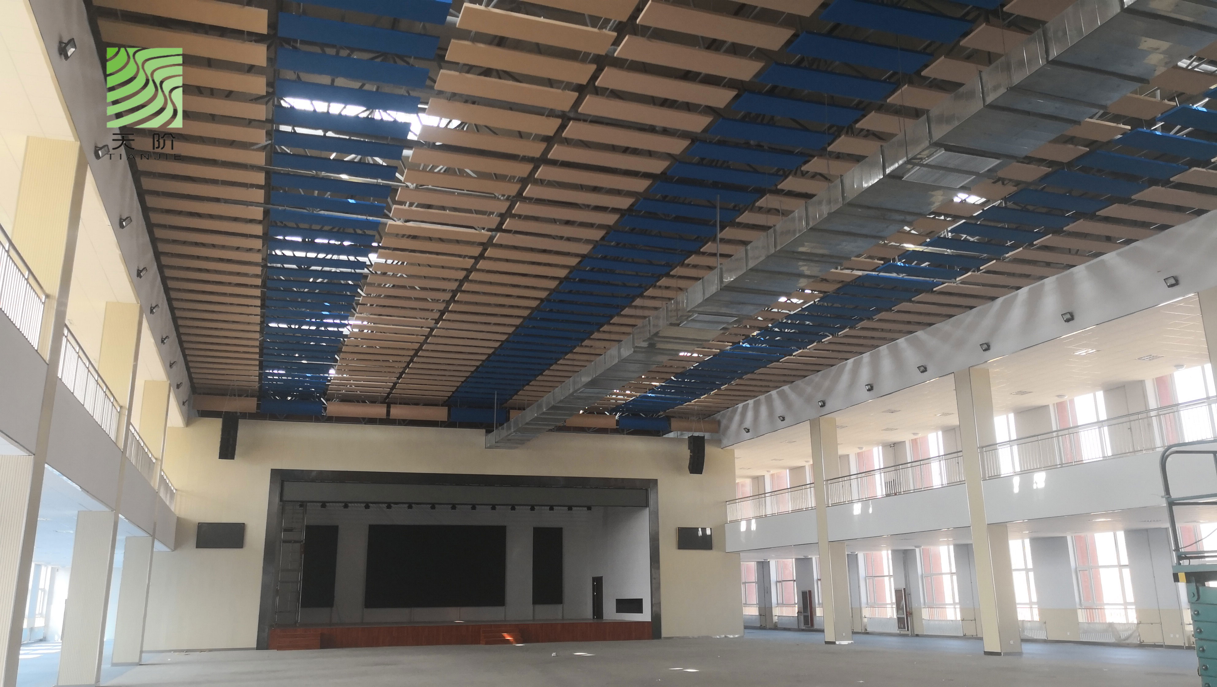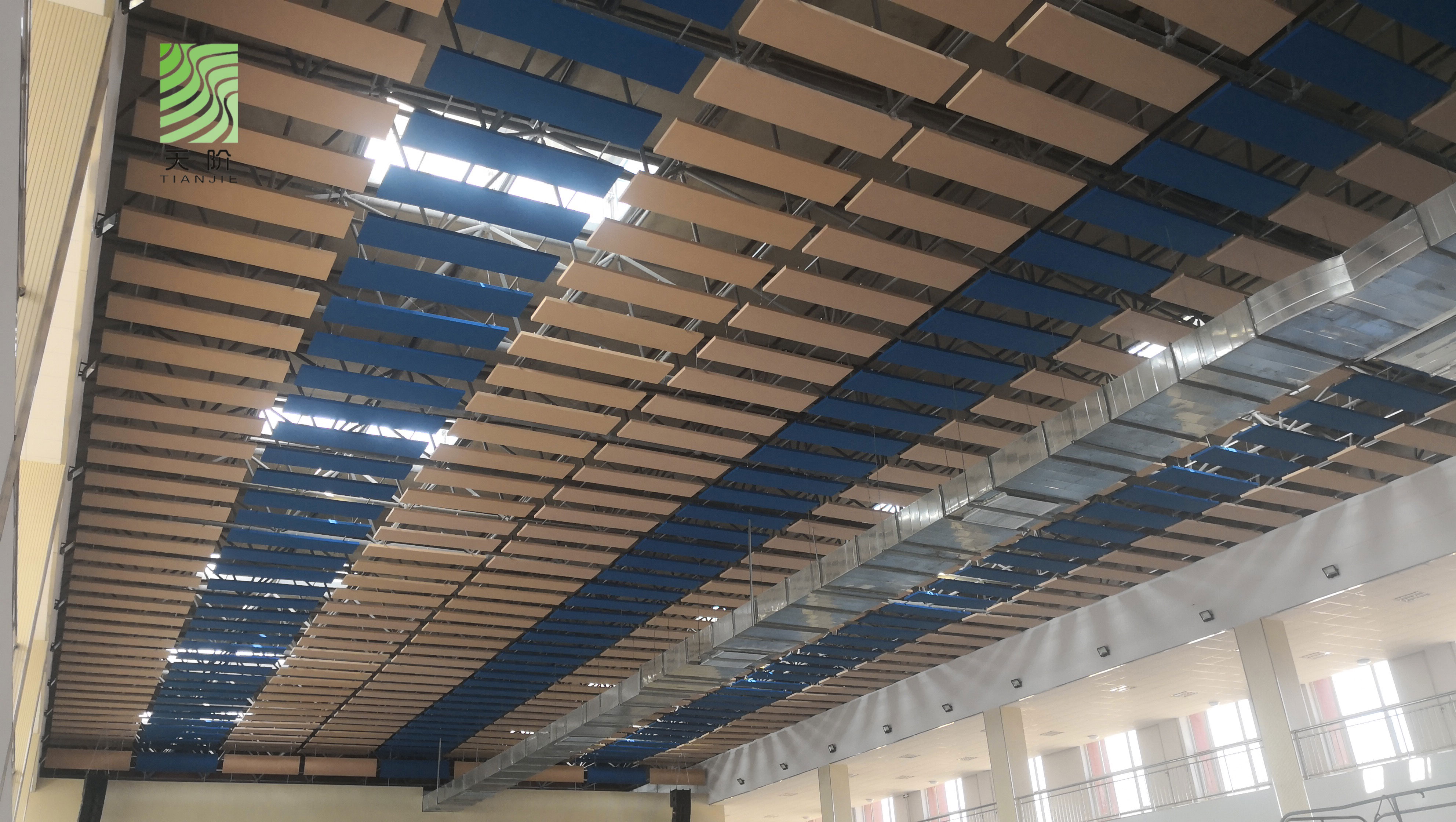 ⒈在棚頂安裝大面積的平面吸聲天花板。這種方法大量用于劇場、禮堂和屋頂為平面形的體育館,效果很好。但如用于弧形拱頂或采用透光屋頂的體育館,這種方式會完全破壞了原來的風格和采光功能,不可取。