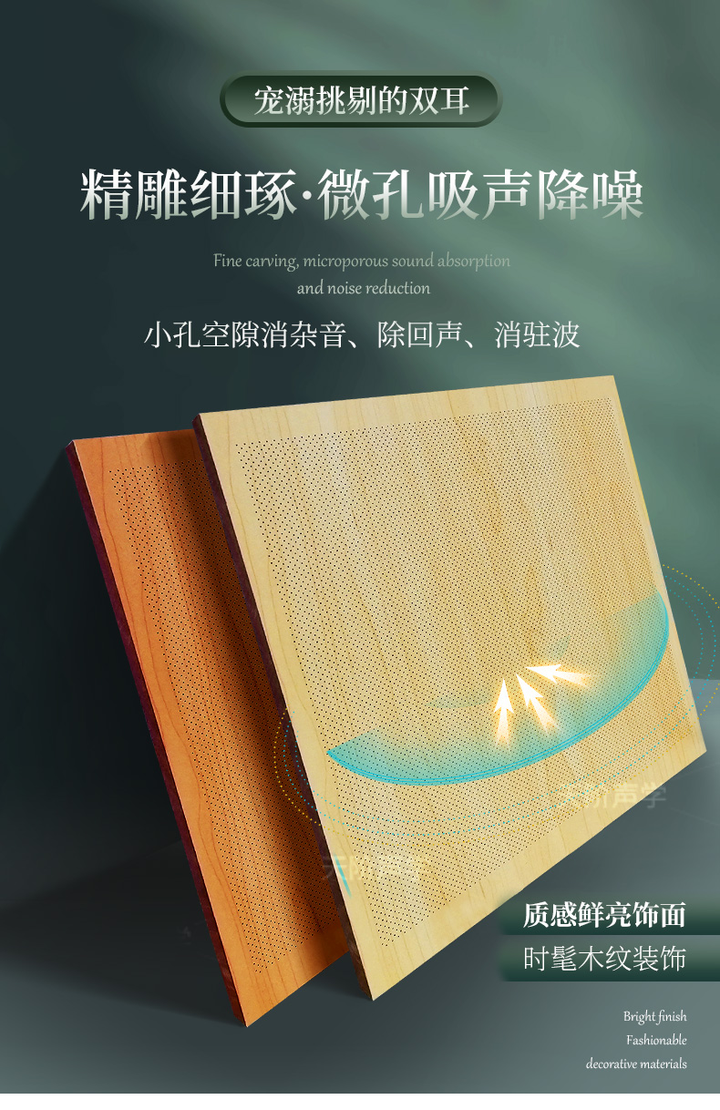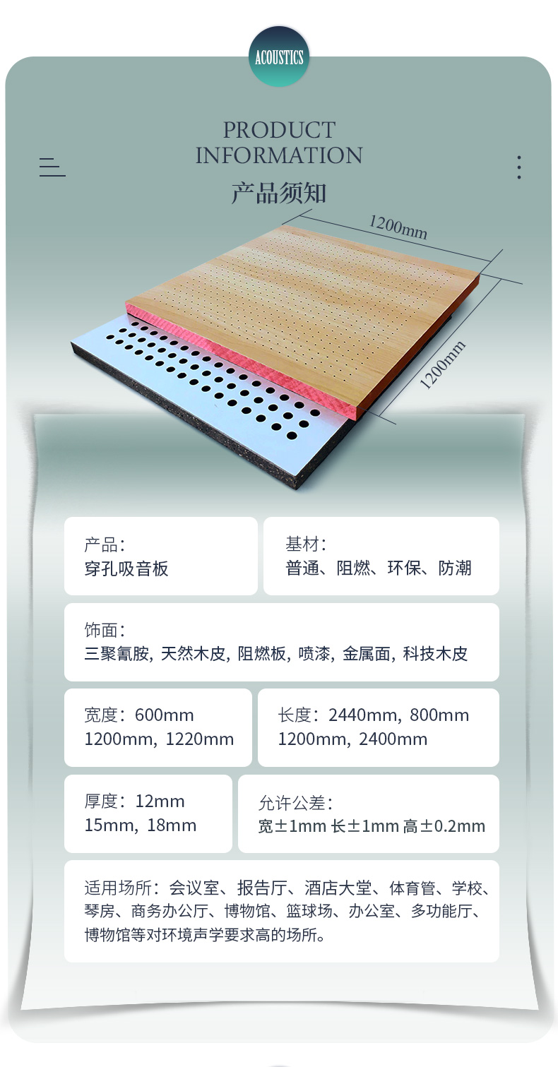 孔木吸音板是一種在密度板上直接穿孔的共振吸聲材料??啄疚舭鍖?duì)吸聲頻譜選擇性較強(qiáng),對(duì)低頻有很好的吸聲性能。如在吸聲結(jié)構(gòu)后空腔上填入適量的吸聲棉可提高中、高頻吸聲效果。