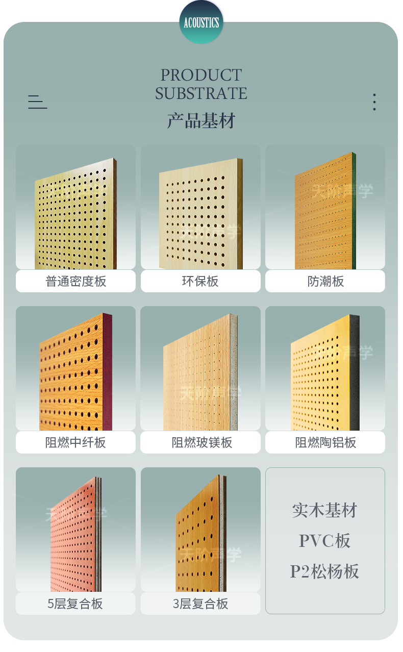 本公司專(zhuān)業(yè)生產(chǎn)木質(zhì)吸音板,布藝吸聲板、吸音軟包、木絲吸音板、聚酯纖維吸聲板、蜂窩陶瓷吸音板、隔音板、空間吸聲體、擴(kuò)散體、隔音材料、干掛板與聲學(xué)活動(dòng)隔斷、固定高隔間等多種聲學(xué)品類(lèi)。