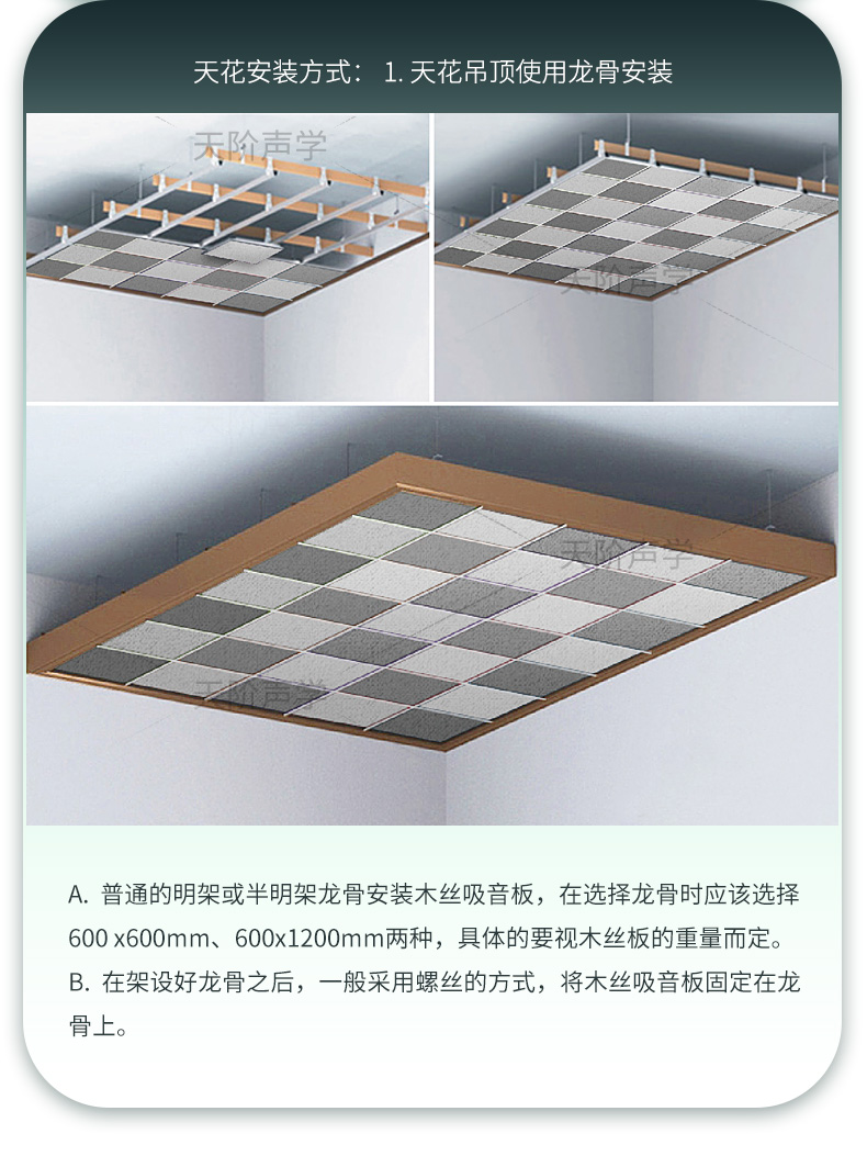 c.輕鋼龍骨,在高層較高或防火要求等級較高的時候,可能不允許施工木龍骨的情況下,一般采用爆炸螺絲吧小段的木墊片固定在輕鋼龍骨上,然后將木絲吸音板固定在木皮上即可。