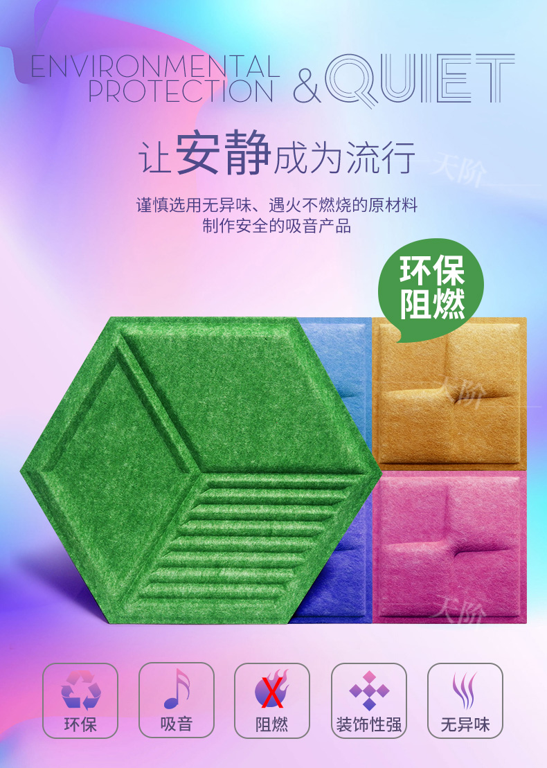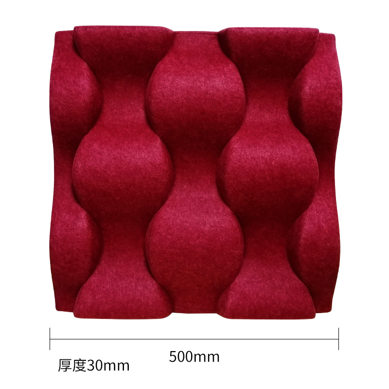 3D聚酯纖維吸音板是今年新研發產品,采用的是綠色環保高新技術熱壓合成繭棉形狀的纖維板材,具有環保,防火,吸音,3D效果裝飾性更立體,易安裝等功能。